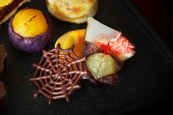 イチジク、梨、柿、ぶどう、りんごなどの秋のフルーツから3種を盛り付け蜘蛛の巣を模したチョコレートを添えています。