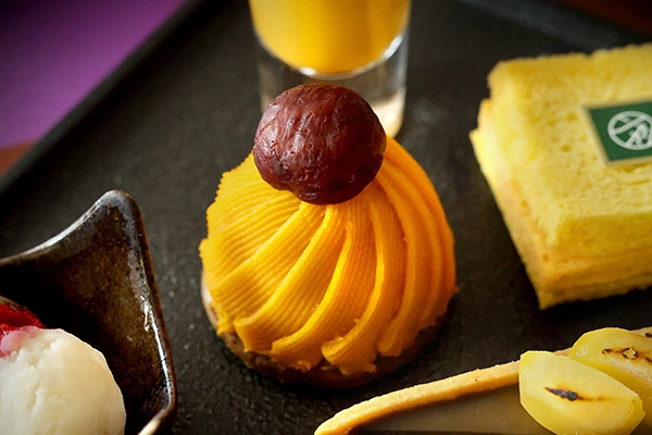 栗を紫芋で包み、和食の技法のひとつ「茶巾絞り」に見立てています。