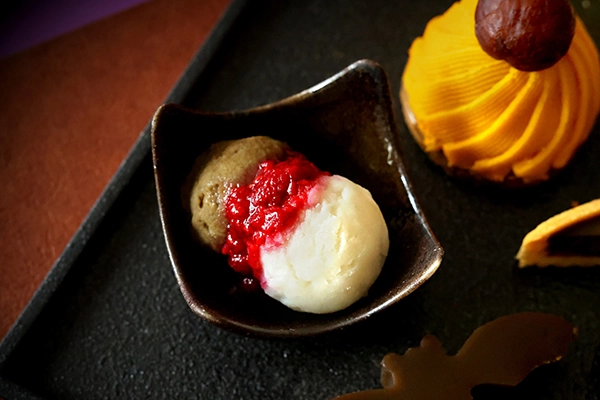 ヴァンパイアをイメージした魅惑の赤いベリーソースを、ほうじ茶アイスとジャージーミルクアイスにかけています。