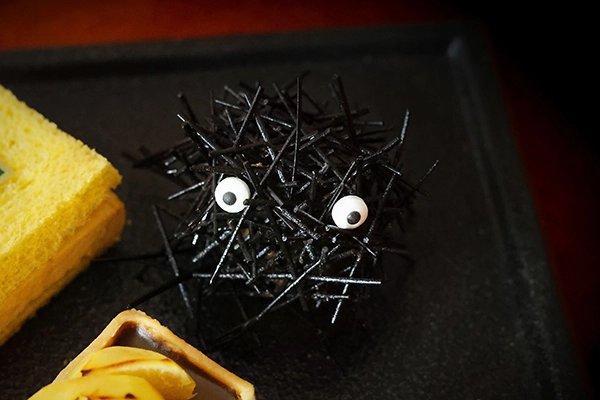続いて「コウモリのほうじ茶羊羹」は、ほうじ茶羊羹を闇夜に潜むコウモリに見立てているのですが、黒いプレートに雰囲気もぴったり!