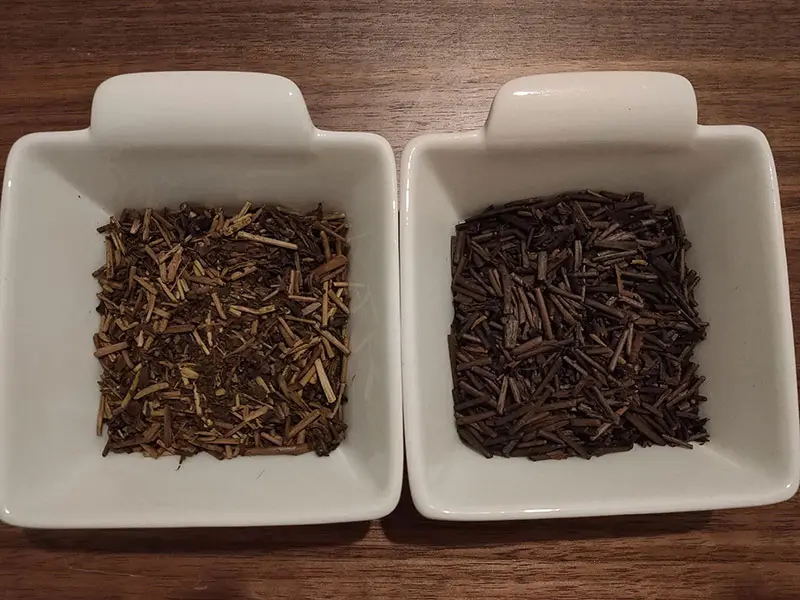 茎の形状も左側のほうじ茶に比べて固く、しっかりとした印象です。