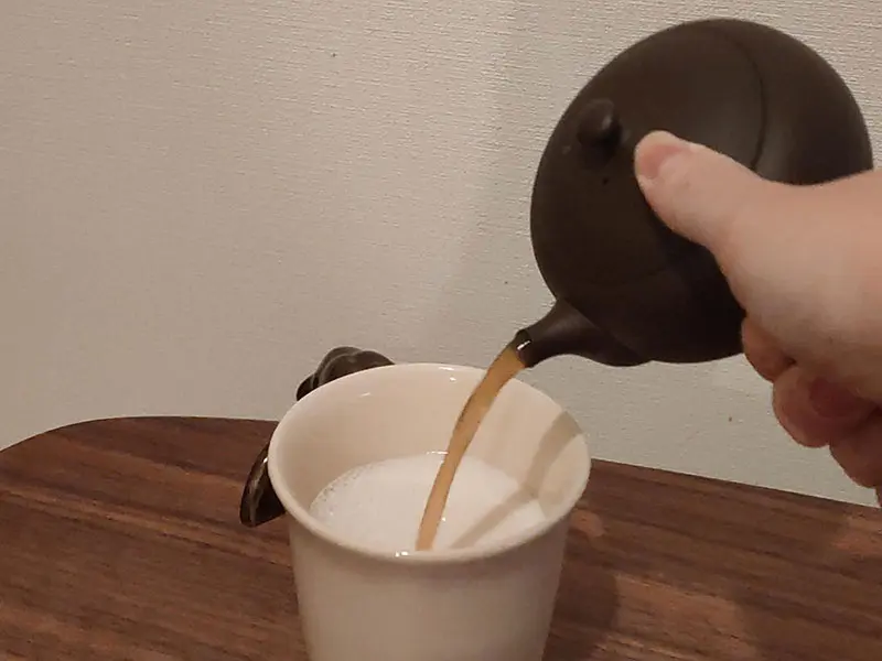 - 温めた牛乳に、淹れたほうじ茶を注ぎ入れます。