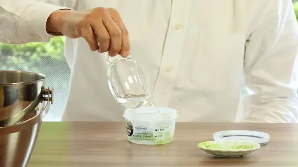 ①タッパーの中に抹茶、氷1つ、水を入れて蓋をしっかり閉めます。