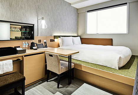 水場をベッドルーム側に配置しお茶を淹れやすくするとともに、ベッド側の床を高くすることで、“縁側”を演出。